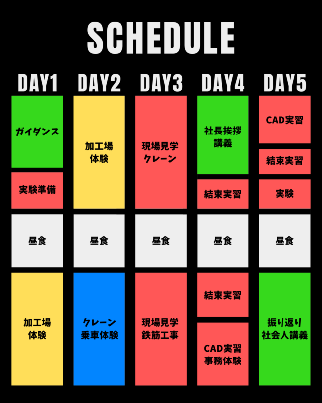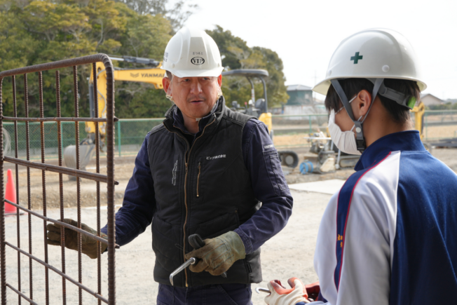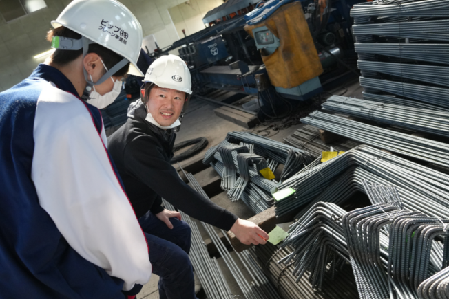 近隣で実際に稼働している「工事真っ盛り」の現場2箇所(クレーン作業現場・鉄筋工事現場)を訪問見学を実施。加工場で作られた製品が、実際の現場でどのように組み上げられていくのか、そのプロセスを間近で視察。現役の技術者から直接レクチャーを受け、現場の活気と精密な工程を深く学ぶ時間となりました。