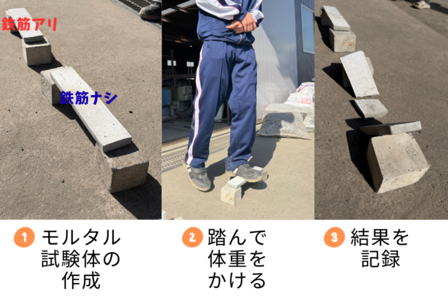 初日はガイダンスからスタートし、スライド資料を用いた会社紹介を通じて、業界の仕組みや弊社の役割について理解を深めていただきました。 座学の後は屋外へ移動し、実習の一環として「鉄筋の有無による強度差」を確認するためのモルタル試験体を自作。最終日の実験に向けて準備を整えました。